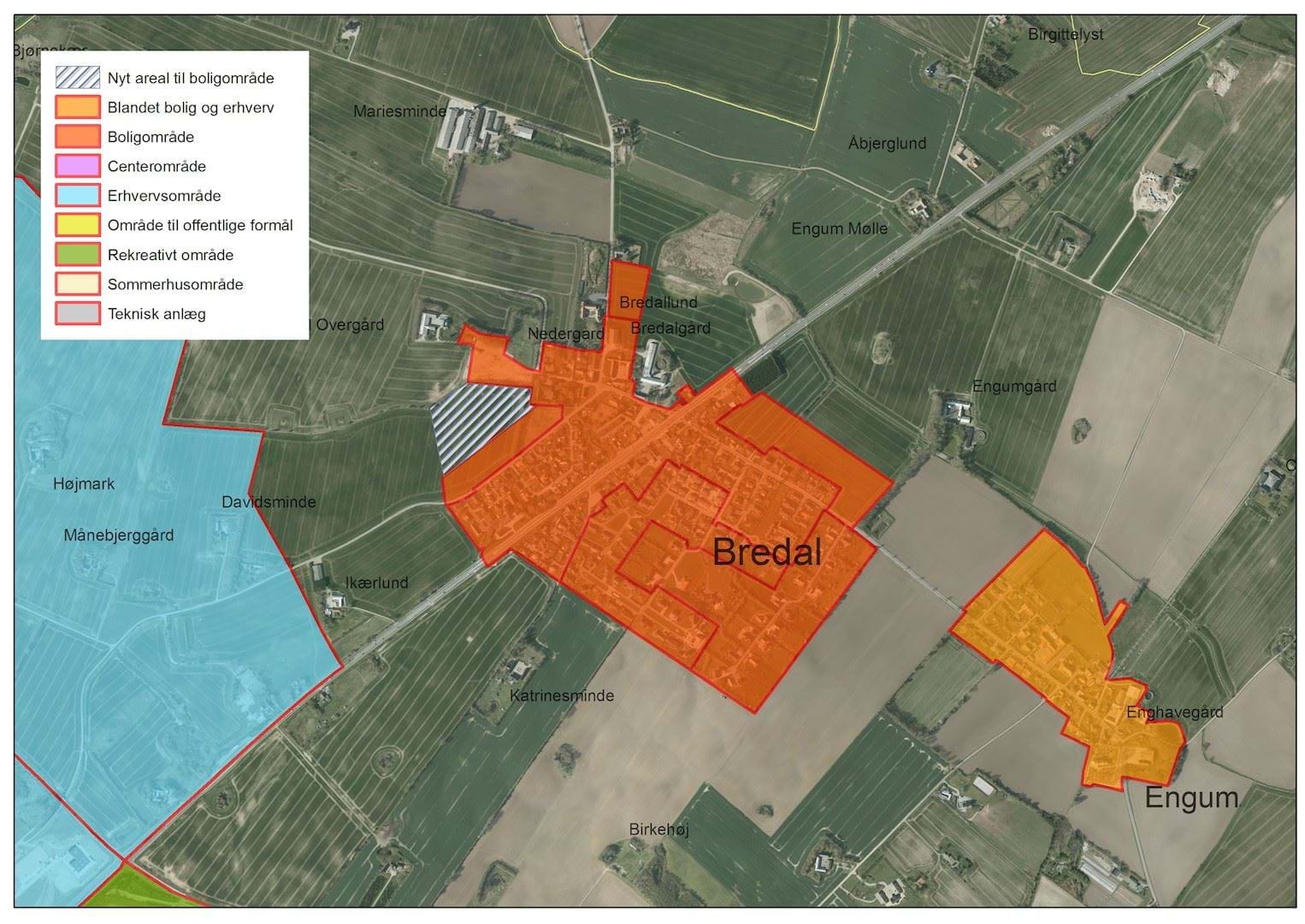 Området ligger i Bredal By, som er en lokalby ca. 1 km nordøst for Vejle By. Byen har nogle få, mindre håndværksvirksomheder og servicefunktioner, men fungerer primært som bosætningsområde. Byen hører til Engum skoles distrikt. Byen oplever befolkningstilvækst og har i dag 654 indbyggere (1. januar 2020).
