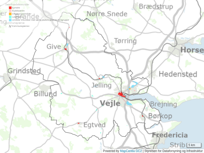 Den samlede detailhandelsstruktur for Vejle Kommune ses på oversigtskort for detailhandelsområder samt på detailkort over de enkelte områder. Placering og størrelse af butikker følger planlovens almindelige bestemmelser med mindre andet er angivet i kommuneplanrammerne. Rammer for nybyggeri fremgår af skemaet for detailhandel.