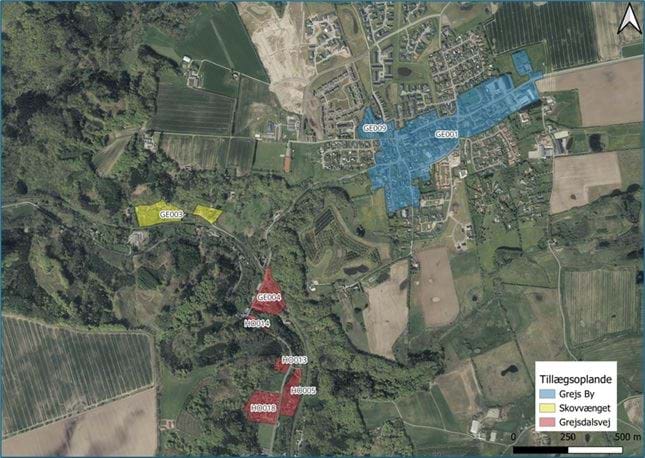 Figur 1: Viser de tre oplande der omfattes af tillæg 23 til Spildevandsplan 2020-2028 for Vejle Kommune. Oplandene udgøres af Grejs By, Skovvænget og et område ved Grejsdalsvej.