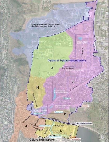 Trykgravitationsledningen, som blev etableret i Klimaprojekt Østbyen etape 1 håndterer overfladevand/afstrømning fra oplandene G, K og I, som svarer til i alt ca. 163 ha. Afstrømningsoplandet til etape 1 er vist på nedenstående kort (fig. 1). Overfladevandet ledes til nyt bassinanlæg i den eksisterende boldbane, og herfra videre i en trykgravitationsledning via Rødkildevej til udløb i Vejle Fjord.