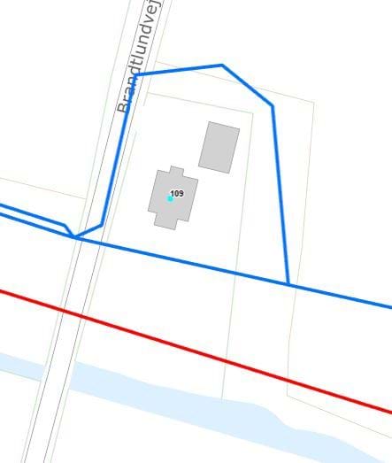 Kort 3 – Regnvandsledningens (blå ledning) Tracé nord om Brandtlundvej 109.