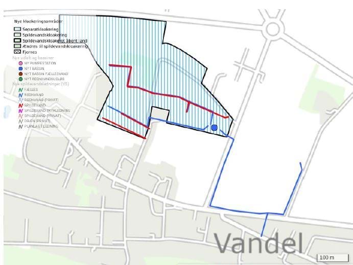 Illustrationen herover viser placeringen af ledninger i og uden for lokalplanområdet, en markering af det planlagte regnvandsbassin (blå plet) og det kommende kloakopland (skraveret blåt).